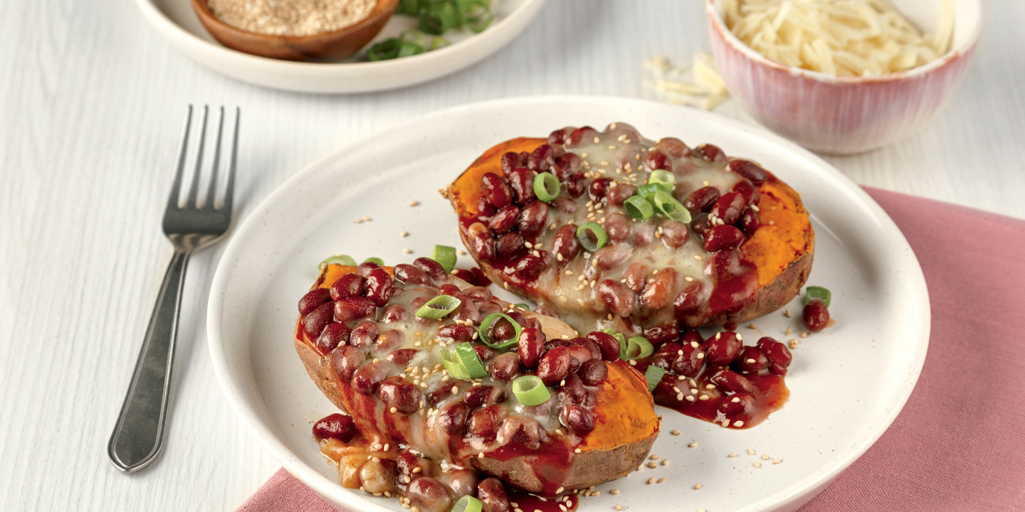 Place the sweet potato halves on a parchment-lined baking sheet. Spoon the red beans with sauce into the cavities. Season with salt and pepper. Top with cheddar.